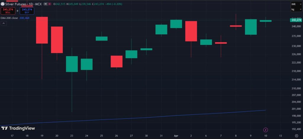 | Silver (MCX) | ₹2,43,274 / kg | ₹2,32,495 / kg | +₹10,779 (+4.6%) |