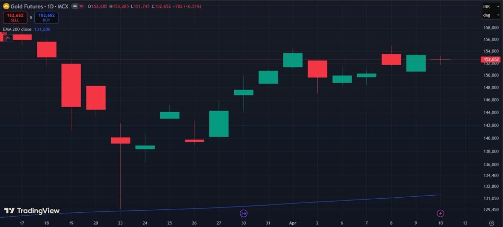 This week’s steady grind higher needs to be read in context. MCX Gold had corrected sharply from its all-time high of around ₹1,63,000, and the last few weeks have been about finding a base. The V-shaped recovery visible on the chart — with lows around ₹1,37,000-38,000 in late March followed by a controlled climb — suggests buyers stepped in with conviction at those levels. The current price sits roughly 6.3% below that all-time peak, but the broader uptrend remains firmly intact. At ₹1,52,652, spot prices are trading nearly 16% above the 200 EMA at ₹1,31,600. This week’s price action — buyer-led, no sharp intraday reversals — looks more like a continuation of recovery than a one-off bounce.