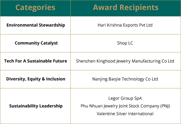 Organised by Informa Markets Jewellery, the Awards programme recognises excellence across five categories: Environmental Stewardship; Community Catalyst; Tech for a Sustainable Future; Diversity, Equity & Inclusion, and Sustainability Leadership.