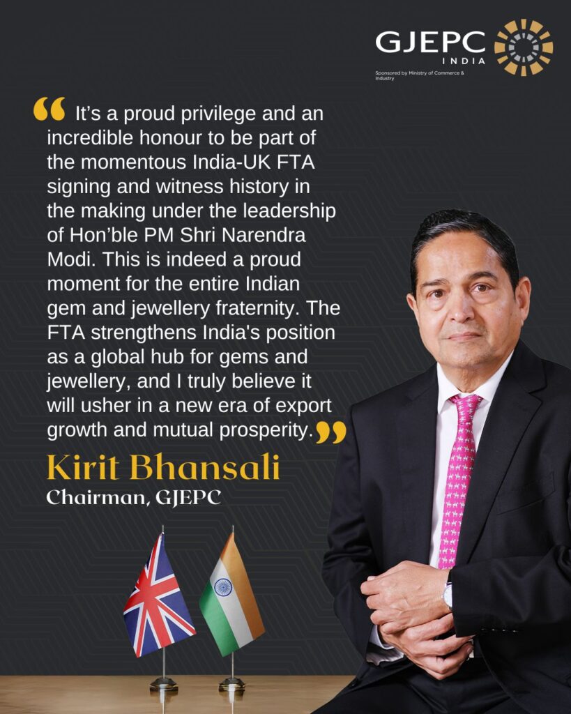 The Gem & Jewellery Export Promotion Council (GJEPC) said the deal could open up better market access, boost exports, and enhance trade relations with the UK. The UK presents a substantial market for jewellery, with annual imports valued at around $3 billion. Currently, India’s share in this market is approximately $400 million, representing about 15 per cent.