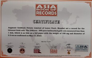Mumbai: The Asia Book of Records has officially recognized Augmont Gold for All for designing the Thinnest Gold Coin. This remarkable accomplishment is a testament to Augmont’s dedication to innovation and making Gold accessible to all. The Thinnest Gold Coin, created by Augmont Gold for All, measures a groundbreaking thickness of less than 1mm with a weight of 100mg and