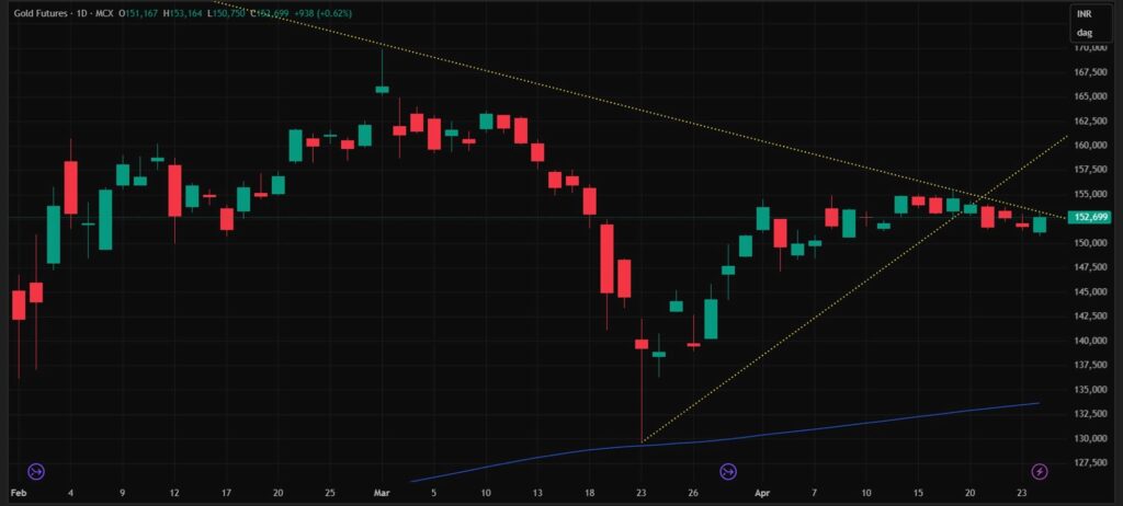 MCX Close (Apr 24): ₹1,52,699 per 10g Prior week (Apr 17): ₹1,54,609 Change: −₹1,910 (−1.2%) | ATH: ₹1,80,779 200 EMA: ~₹1,32,500