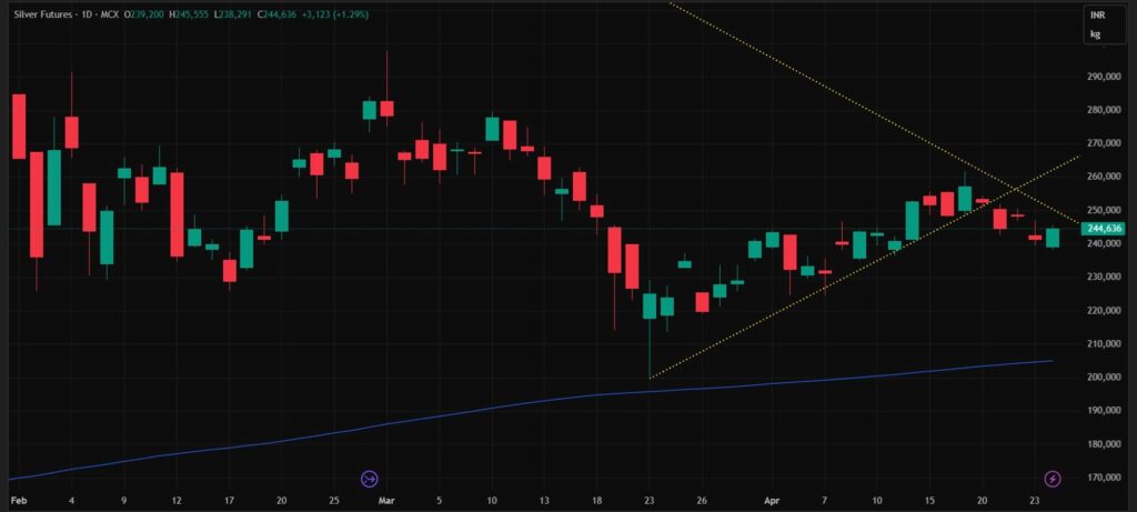 MCX Close (Apr 24): ₹2,44,636 per kg Prior week (Apr 17): ₹2,57,142 Change: −₹12,506 (−4.9%) | ATH: ₹4,20,048 200 EMA: ~₹2,01,500